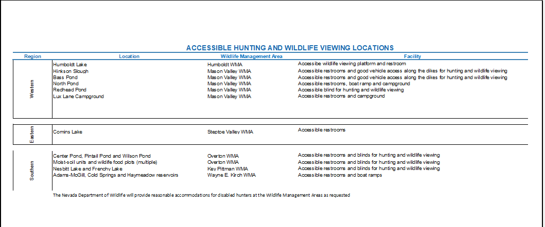 The Nevada Department of Wildlife will provide reasonable accommodations for disabled hunters at the Wildlife Management Areas as requested.