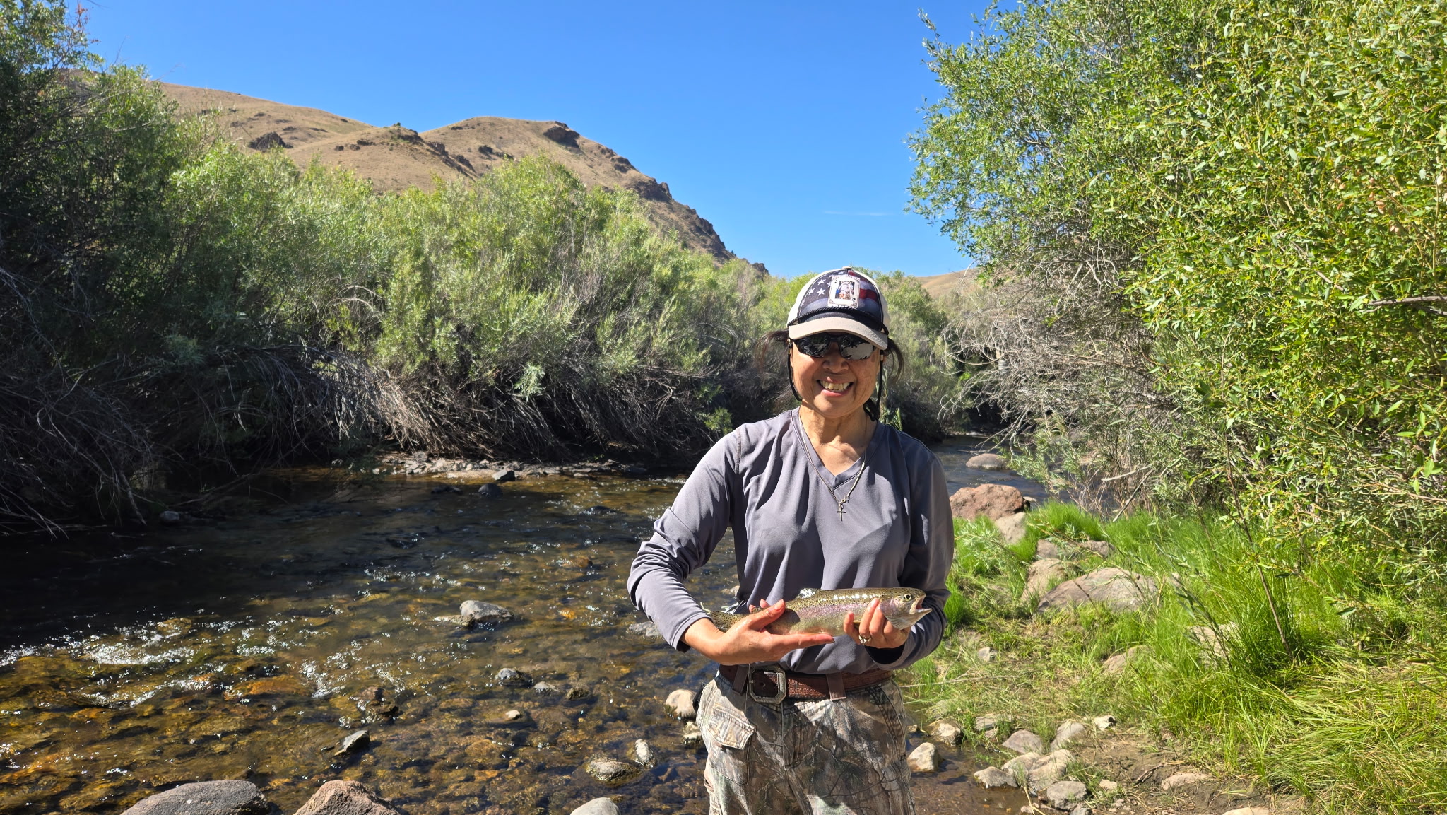 A happy angler with a rainbow trout caught from a northeastern Nevada stream in late July.
