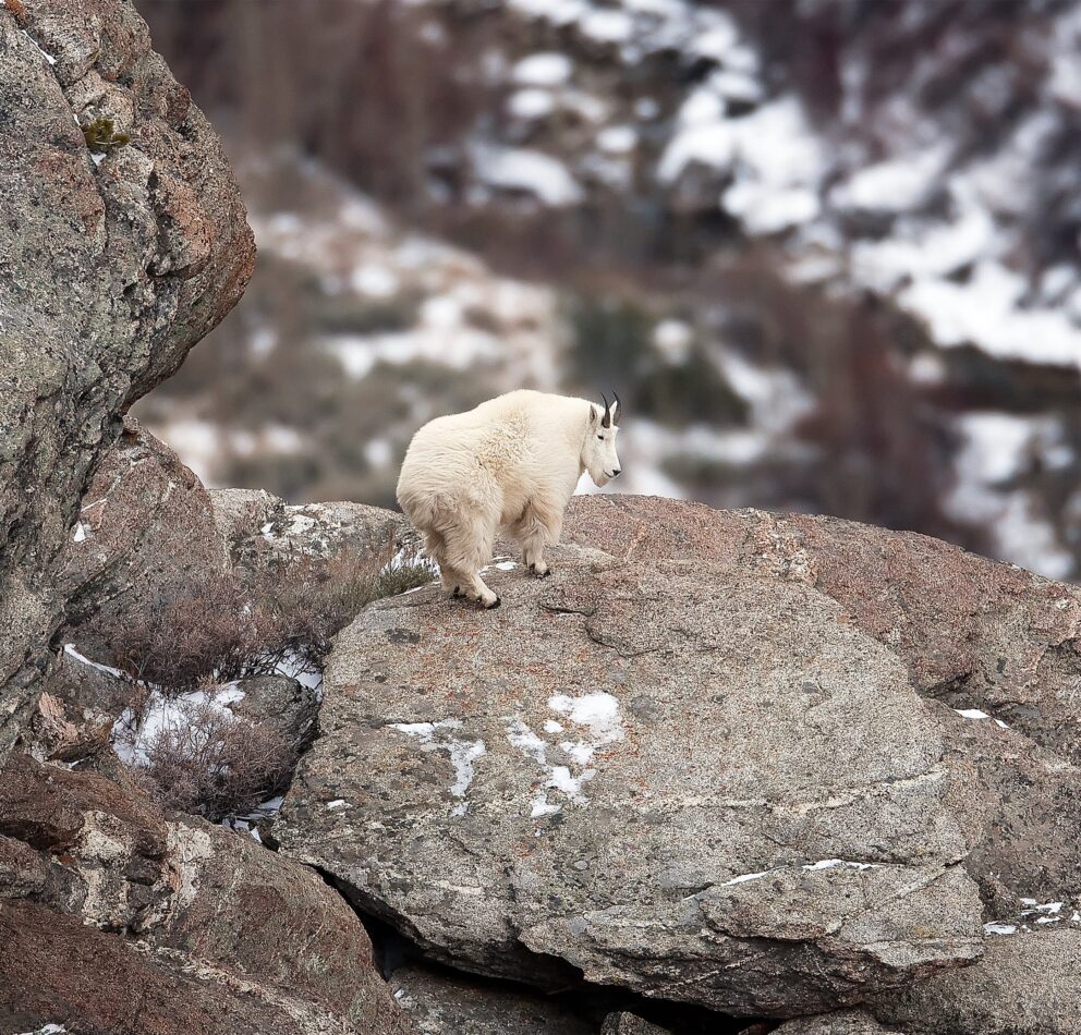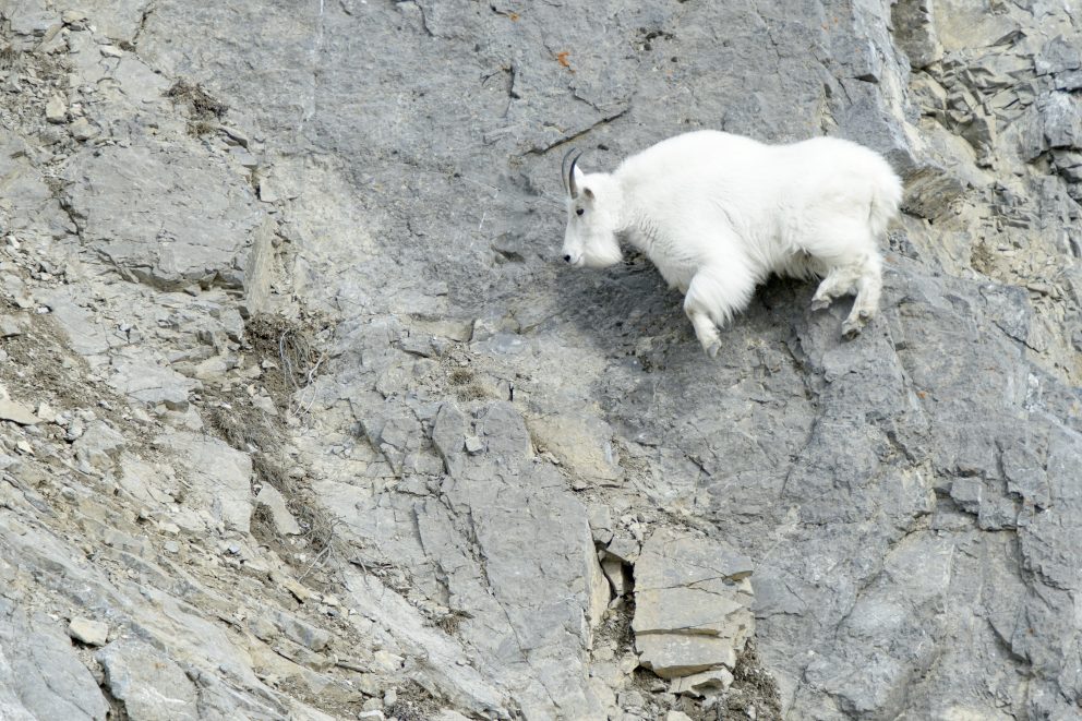 Mountain Goats usually consume their food depending on what is available to them at the time. This herbivore eats plants, grasses, mosses, and other alpine vegetation. In the summer they will eat sedges and grasses and in the winter their diet consists of coniferous trees and leaves. They drink water and eat snow to stay hydrated. Groups of Mountain Goats are referred to as bands. Adult males, called “billies,” are larger than the “nannies,” or adult females. They are polygamous animals, with the mating, or “rut,” season occurring from November to January. The gestation period is about 175 to 180 days. Birth generally takes place in late May and early June with one and sometimes two “kids,” or young. Females (nannies) will often form large groups while males (billies) will often remain solitary or with much smaller groups. Their hooves act like suction cups on steep rocky terrain and their young, called “kids,” can walk and jump about 10 minutes after birth. They can experience predation from bears, mountain lions, wolves, golden eagles, and humans.