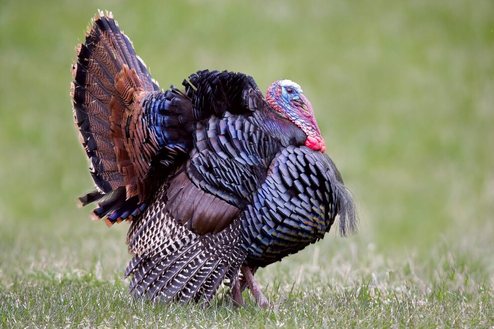 Although large in size, Turkeys will sleep in trees. The snoods, or fleshy appendages on the face of the males, is important for mating. Longer snoods are more preferred among females